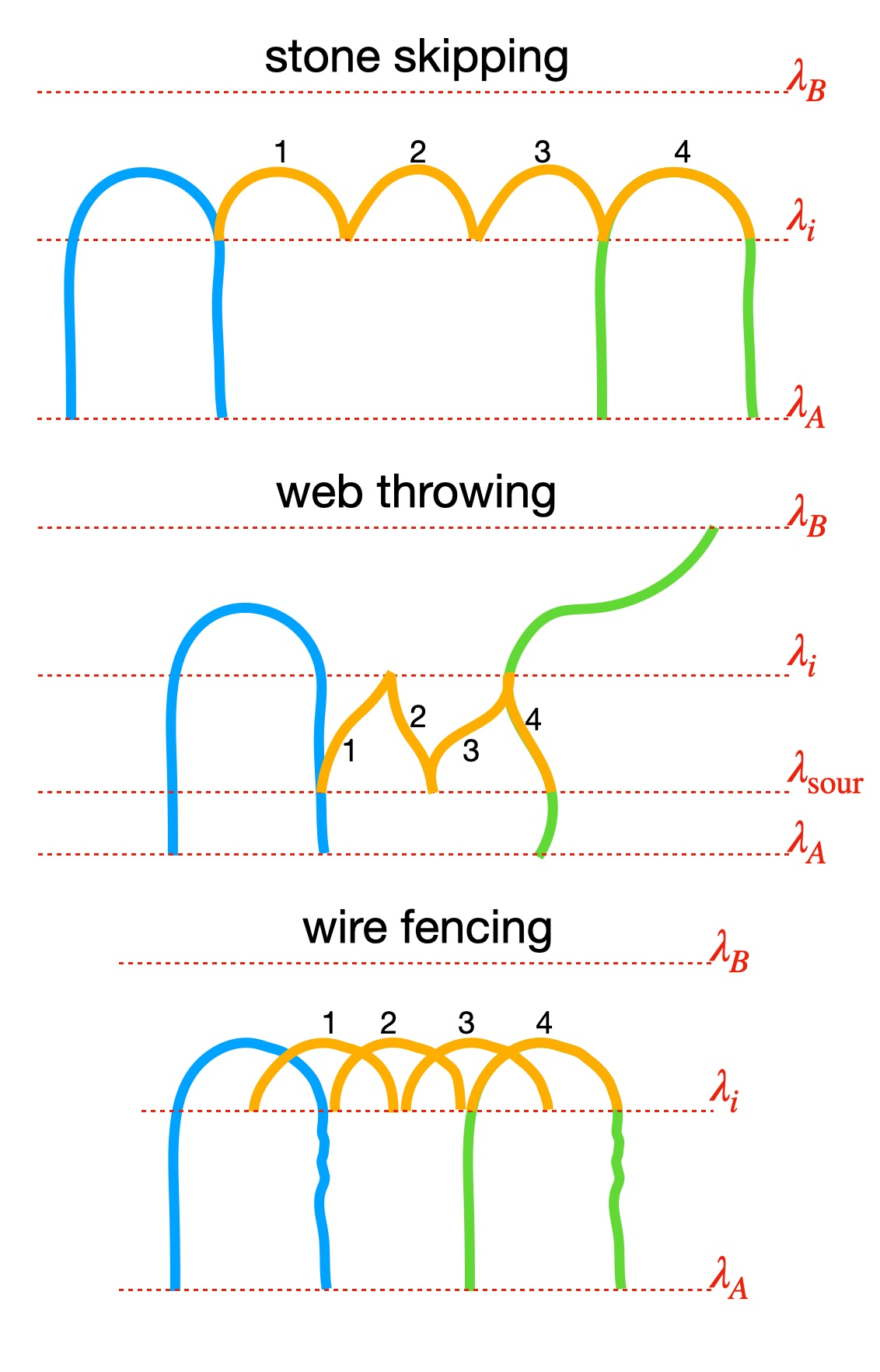 Fig. 25 Cartoon representation of the three subtrajectory moves: stone skipping, web throwing and web throwing. The old path is shown in blue. Four subtrajectories are shown in orange. The final new path consists of the fourth subtrajectory and its extensions in green.¶